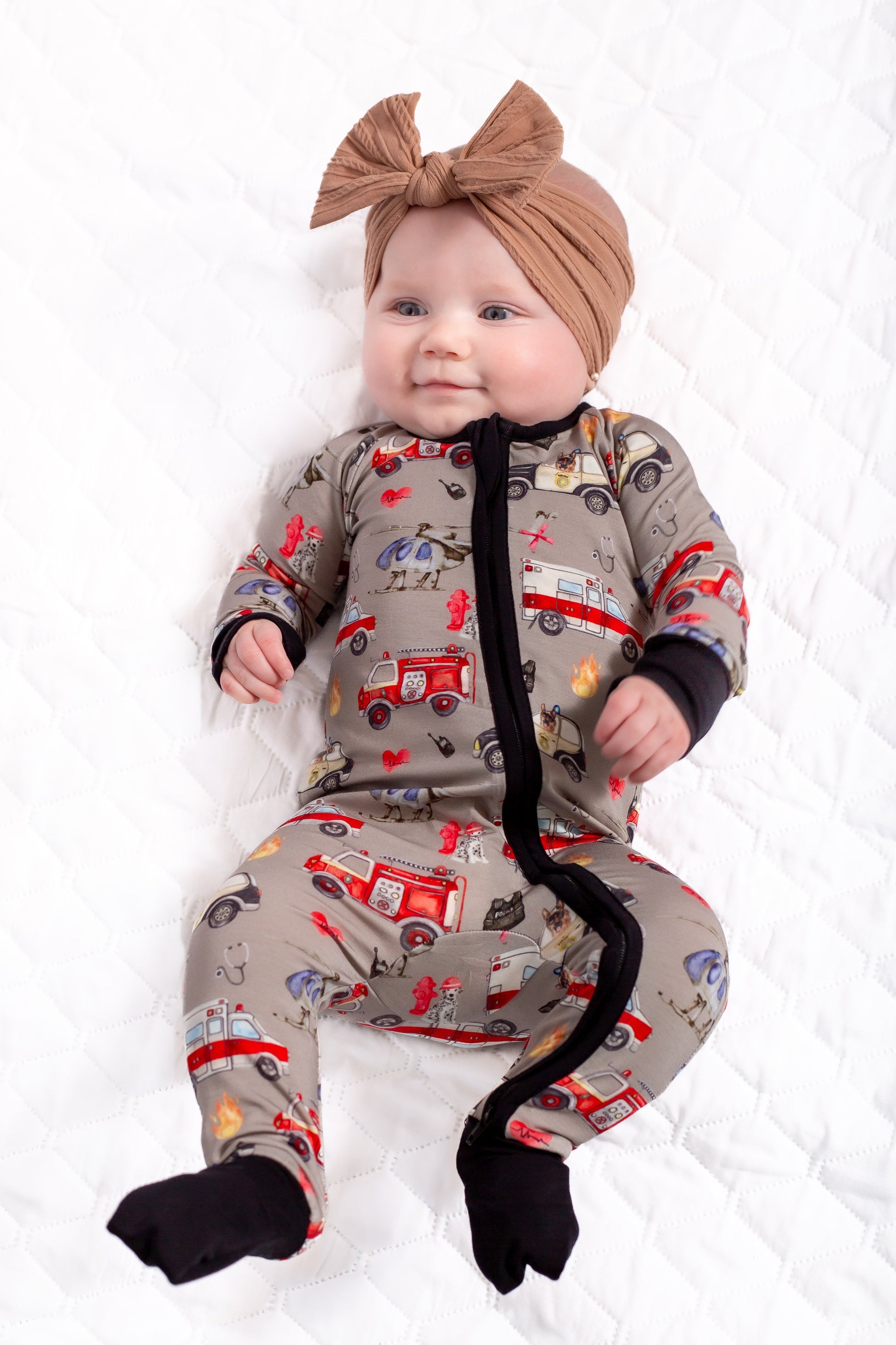 These first responders (and their canine companions) are ready to respond! The print features fire trucks, police cars, ambulances, and a helicopter on gray. These are the perfect thickness for buttery soft jammies.
